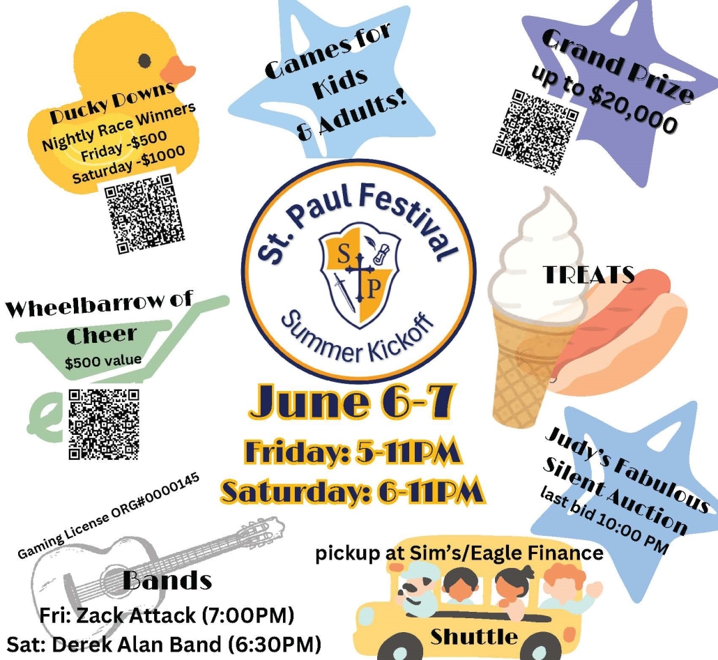 The Shuttle will pick-up at Sim’s Furniture/Eagle Finance during all Festival hours and for Mass on Saturday starting at 4:30 p.m.